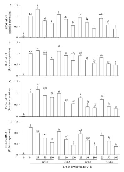 Inhibitory effects of GSEs steamed for different times (0–6 h) on relative mRNA expression of four pro-inflammatory factors in LPS-induced RAW264.7 cells. Cells were incubated with GSE0, GSE2, GSE4, GSE6 (25, 50, or 100 µg mL−1), or vehicle for 2 h and then treated with 100 ng mL−1 LPS at 37 °C. After a 24-h treatment with LPS, the mRNA expression levels of inducible nitric oxide synthase (iNOS) (A), IL-6 (B), TNF-α (C) and cyclooxygenase-2 (COX-2) (D) were determined using qRT-PCR and normalized to GraPDH levels. The results shown here are representative of three independent experiments and are presented as means ± SD. Different letters indicate significant differences at p < 0.05 based on Duncan’s multiple range test.