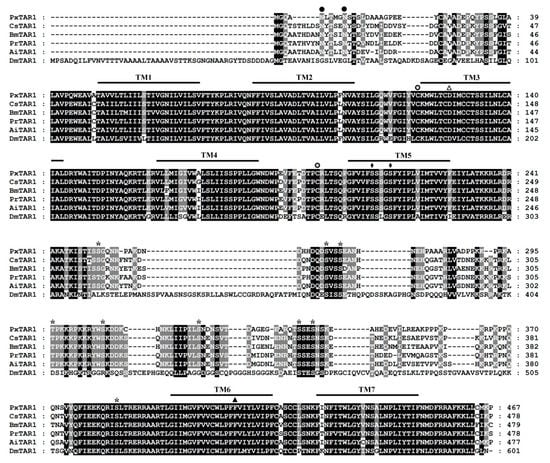 Protein transmembrane analysis showed that the PxTAR1 protein has seven transmembrane helical regions (each region was 23 AA long), and the N-terminal of the protein was located at the outer side of the cell and the C-terminal was located at the other side. There were two cysteines located at the extracellular ring between TM2 and TM3 and TM4 and TM5, presumably functioning in the formation of disulfide bonds to enhance protein stability. There were also two N-glycosylation sites in the TAR1 N-terminal, which may play a role in assisting protein folding and regulating protein activity. Residues D127 in TM3 and S211 and S215 in TM5 were detected, likely functioning in substrate binding, and this has also been seen in silkworms []. The intracellular loop between TM5 and TM6 was 168 AAs long, and contained several PKC recognized sites, which are necessary for the interaction of TAR1 with G proteins []. This intracellular loop also contained a conserved FxxxWLPFF motif in TM6, which is considered essential for bioamine binding [] (Figure 1).