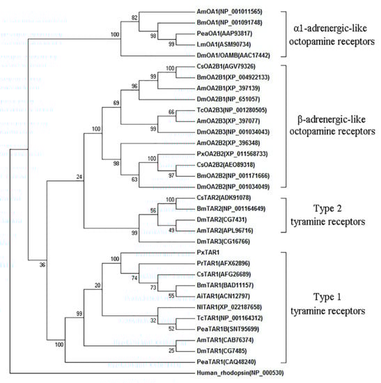 Phylogenetic tree analysis of representative members of the different TARs and OARs. Alignment was performed using amino acid sequences from TM1 to TM7 and the numbers at the nodes of the branches represent the level of bootstrap support for each branch. GenBank accession numbers of each receptor sequences are listed in the tree. Abbreviations of species in alphabetical order are: Ai, Amphibalanus improvises; Am, Apis melifera; Bm, Bombys mori; Cs, C. suppressalis; Dm, D. melanogaster; Dp, Danaus plexippus; Lm, L. migratoria; Nl, Nilaparvata lugens; Pea, P. americana; Pr, P. rapae; Px, P, xylostella; and Tc, Tribolium castaneum.
