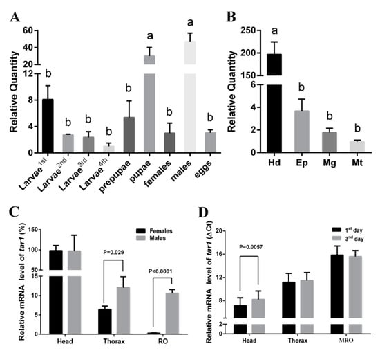 Relative expression (mean ± SE) of tar1 in P. xylostella. (A) Expression of Pxtar1 genes in different development stages (first to fourth larvae, pre-pupae, pupae, adults, and eggs). Pxtar1 in fourth larvae was used as a comparator. (B) Expression of Pxtar1 in tissues (the head (Hd), epidermis (Ep), midgut (Mg), and Malpighian tubules (Mt)) of the fourth instar larvae. Pxtar1 in Mt was used as a comparator. (C) Expression patterns of Pxtar1 in adult tissues (head, thorax, female reproductive organs (FROs) and male reproductive organs (MROs)), Pxtar1 in FRO was used as a comparator. (D) Expression of the Pxtar1 in female adults in the head and MRO at first and third days. Data were mean values of three independent experiments (n = 3) and normalized to endogenous ribosomal protein L32, the internal control