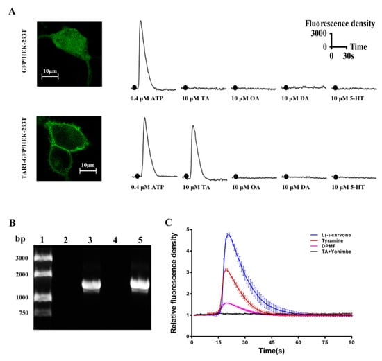 PxTAR1-GFP fusion proteins were mainly localized in membrane, and GFP protein was diffusely localized across the whole cell (Figure 4A). Common biogenic amines including TA, OA, dopamine (DA), and serotonin (5-HT) (the final concentration was 10 μM) were used to examine the functional properties of the PxTAR1 in HEK-293 cells. TA could elicit Ca2+ responses at concentrations of 10 μM, OA could elicit Ca2+ responses at concentrations of 100 μM, (Figure S3) and no other compounds elicited Ca2+ expression at 10 μM concentrations (Figure 4A). This suggests that the PxTAR1 was selectively activated by TA and activation was coupled with intracellular Ca2+ mobilization.