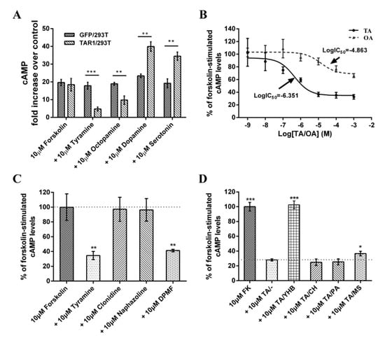 Regulation of (cAMP)i in HEK-293T cells stably expressing the PxTAR1 receptor (TAR1/293T) compared to GFP/293T cells (negative control). (A) Regulation of forskolin and biogenic amines on (cAMP)i. (B) Dose–response analysis of TAR1/293T cells to TA and OA and attenuation of forskolin-stimulated intracellular cAMP levels. (C) Regulation of putative agonists (clonidine, naphazoline, and DPMF) on forskolin-stimulated cAMP levels in TAR1/293T cells. (D) Regulation of putative antagonists on TA attenuation of forskolin-stimulated intracellular cAMP levels. Abbreviations: TA/–, tyramine and no antagonist; TA/YHB, tyramine + yohimbine; TA/CH, tyramine + chlorpromazine; TA/PA, tyramine + phentolamine; TA/MS, tyramine + mianserin. Data are presented as means ± SE of three experiments (n = 3). Statistically significant differences: *** p ≤ 0.001, ** p ≤ 0.01, * p ≤ 0.05.