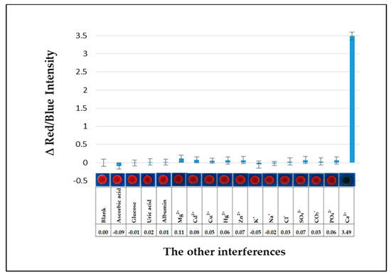 Next, the aggregation of AHMP-AuNPs induced by Ca2+ was investigated at various incubation times (1–30 min). The aggregation of the AHMP-AuNPs occurred immediately after the addition of Ca2+ and was completed in one minute. In other words, the red/blue intensity from the aggregation of AHMP-AuNPs induced by Ca2+ can be measured at one minute. When AHMP-AuNPs were left on the device for over five minutes, the red/blue intensity of the blank was increased from the initial (Figure S1) because of self-aggregation of the AHMP-AuNPs. In the case of interferences, Mg2+ was first selected as a representative of other positive ions, as it has an atomic radius and positive charge nearly equal to those of Ca2+ to investigate the possibility of using this proposed probe. From these results, it was found that the red/blue intensity of AHMP-AuNPs in the presence of Mg2+ was decreased more than 5%, compared to the blank, after five minutes. This indicated that other positive ions may also interfere with the proposed method if the incubation time was over five minutes. From this critical observation, we strongly believe that an incubation time of one minute is appropriate to specify the detection of Ca2+ by electrostatic force and size selective in the presence of other divalent ions. Therefore, the incubation time is a critical point that must be kept in mind for the selectivity study in the following section. Finally, to find a suitable quantity of the AHMP-AuNPs to sufficiently interact with Ca2+, the reagent volume ratio was tested between 5:25 and 25:5 (AHMP-AuNPs:Ca2+). The red/blue intensity of AHMP-AuNPs after mixing with Ca2+ was measured at various reagent volume ratios with 30 µL maximum volume. As shown in Figure S2, the volume ratio of AHMP-AuNPs:Ca2+ at 25:5 provided the highest red/blue intensity. This indicated that a 25:5 ratio of AHMP-AuNPs:Ca2+ was sufficient and appropriate for the determination of Ca2+.
