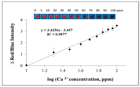 Transparency sheet-based devices for the quantitative analysis of Ca2+ and the calibration plot of Δred/blue intensity and the log concentration of Ca2+ (error bar represented the standard deviation at n = 3). Other conditions used were the same as the optimal values.