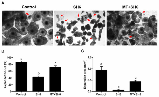 2.3. SH6 Treatment Adversely Affects, While Melatonin Rescues, the Nuclear Maturation and Cumulus Cell Expansion