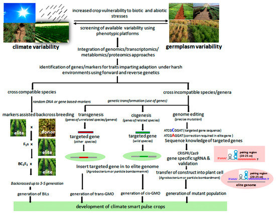 During the last three decades, considerable advances have been made in the genomics of pulse crops, and genome sequences of many pulse crops are now available in the public domain. This has resulted in the identification of genes/QTLs controlling various agromorphological traits. These advances have allowed breeders to incorporate multiple traits into an improved genetic background through genomics-assisted selection, thereby resulting in the development of stress-resilient pulse crops. For example, introgressed lines of soybean carrying the Ncl gene have the potential to regulate transport and accumulation of Na+ and Cl−. This has resulted in 3.6–5.5-fold greater yield advantages over conventional cultivars under salinity conditions. Such advances have made it possible to grow soybean in saline-affected areas [283]. Moreover, introgression of genes from tepary bean (Phaseolus acutifolius A. Gray) resulted in the development of elite common bean lines that are able to grow at 4 °C above the limit (18–19 °C) normally tolerated by this crop [284]. In chickpea, efforts to introgress the drought-tolerant QTL into the background of popular cultivars of Africa and Asia through marker-assisted selection have resulted in several chickpea introgression lines. In rainfed yield trials, these lines have shown at least a 10% yield advantage over the recurrent parent [285]. Genome editing technology based on CRISPR/Cas9 can be used to manipulate genes responsible for adaptation in adverse environmental conditions, and the resulting mutant populations can be screened under stressful conditions. Therefore, initiatives for developing climate-resilient varieties using genomics-based approaches merit special attention.