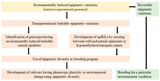 Epigenetics denotes heritable changes in gene expression that can occur due to methylation of DNA or post-translational modification of histones involved in chromatin formation rather than changes in gene sequences [236]. Epigenetic variations can be reversible or transgenerational [237]. In reversible epigenetic variation, transcriptional memory may be responsive to cell fate decisions, developmental switches, or stress responses; otherwise, the gene expresses itself normally. Such epigenetic variations are not inherited by the next generation and, hence, are not useful for epigenetic breeding. Iwasaki [238] discussed the chromatin resetting mechanism related to the stability of epigenetic states under various stress conditions and revealed that silencing of reporter transgenes as well as endogenous loci occurs in response to various abiotic stresses such as high salinity, drought, heat, or UV radiation. However, such stress-induced transcriptional activation is mostly transient, and silencing is rapidly restored after resumption of optimal growth conditions. On the other hand, transgenerational epigenetic variation causes changes in gene expression that are stably transmitted to subsequent generations through mitosis or meiosis. Such epigenetic marks that create natural phenotypic variation play an important role in adaptations of plants in different environmental conditions [239,240,241,242]. Epialleles or epimutations, creating a mutant or an alternative phenotype, are generated through epigenetic changes [237,243]. According to Slotkin and Martienssen [244], these epialleles may result from changes in either genome or environmental conditions. Zhang and Hsieh [245] identified pure epialleles originating independently of any genetic variation in their model and other crop plant species. However, epialleles which are caused by genetic variations are difficult to detect without comprehensive genome structural analysis. Therefore, it is challenging to identify genomic loci that undergo epigenetic changes in response to environmental conditions [246]. According to Meyer [246], the use of such genomic loci in epigenetic breeding is a powerful strategy for developing climate-smart pulses under global warming conditions because such epialleles are able to improve the plant’s ability to adapt to the inducing conditions in a heritable manner. Lele et al. [242] used amplified fragment length polymorphism (AFLP) and methylation-sensitive AFLP (MSAFLP) to identify the differences in genetic diversity caused by epigenetic or genetic variations and to study the role of epigenetic variation in the adaptation of Vitex negundo var. heterophylla (Chinese chaste tree) in different habitats. This study showed a relatively high level of genetic and epigenetic diversity but very low genetic and epigenetic differences between habitats within sites.