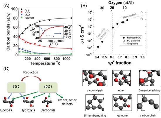 (A) Evolution of sp C=C carbon and different oxygen functionalities at different annealing temperatures. The inset correlates the total oxygen concentration with the sp C=C content at different reduction temperatures. (B) Conductivity of rGO thin films as a function of the sp C=C content/oxygen content. (C) Dominant oxygen functional groups present in GO and rGO, along with close-ups of various other oxygen groups and defects that are created upon reduction of GO. Figures reproduced with permission from: (A,B) [], Wiley©.