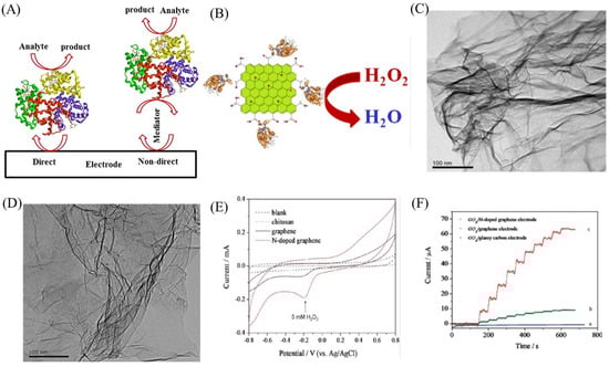 (A) Schematic of the direct and mediated electrochemical biosensor. (B) Detection of HO on graphene quantum dots modified electrode. (C,D) TEM images of the graphene and N-doped graphene. (E) HO detection on graphene and N-doped graphene. (F) Glucose detection on graphene and N-doped graphene modified electrodes. Figures reproduced with permission from: (B) [], Springer©; and (C–F) [], ACS©.