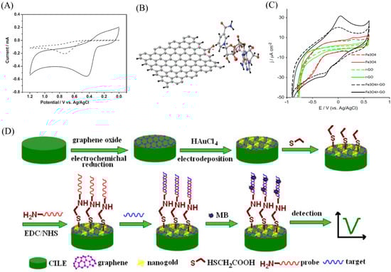 (A) Cyclic voltammetric responses of the bare GC (dashed line) and rGO-based GC (solid line) in 0.1 M PBS (pH 6.8) PBS containing 1 mM NADH. (B) Graphene edge terminated by hydrogen atoms and containing one -COO- group. (C) Electrochemical responses of FeO/GC, r-GO/GC and FeO/r-GO/GC electrodes in 0.1 M PBS (pH 7.0) and scan rate 20 mV s in the absence (dashed line) and presence (solid line) of 0.5 mM NADH. (D) Schematic representation of the electrochemical DNA biosensor fabrication and detection. Figures reproduced with permission from: (A) [], Wiley©; (B), [], Wiley©; and (C) [], Elsevier©; and (D) [], Elsevier©.