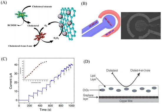 Additionally, Dey et al. reported a bienzymatic electrode i.e., ChOx and cholesterol esterase immobilized on graphene and platinum nanoparticle hybrid for cholesterol detection [].This bienzymatic electrode was very sensitive and selective to cholesterol with fast response time. The same electrode configuration was fabricated on screen printed electrode to reduce the measurement volume. Figure 5A shows a schematic of the bienzymatic electrode for cholesterol detection. Nguyen et al. immobilized ChOx on CVD synthesized graphene electrode modified with FeO-doped polyaniline film for cholesterol detection []. Figure 5B,C shows the electrode design and the amperometric responses for different concentrations of cholesterol. A novel potentiometric sensor for cholesterol was reported by Nikoleli et al., in which a stable polymeric lipid membrane mixed with ChOx on graphene is used []. Figure 5D shows a schematic of the sensor electrode and the detection mechanism. The strong biocompatibility was achieved using lipid membrane and hence recommended for real biological and blood sample detection.