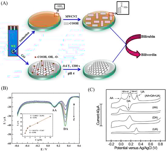 (A) Schematic showing the preparation of the MWCNT based (top row) or electrochemically reduced graphene oxide (ErGO) based (bottom row) bilirubin sensors. (B) Differential pulse voltammograms of DA (from a to f: 0.05, 0.5, 1, 2, 5 and 10 M) at Gr/p-ABA/GCE in the presence of 100 M AA. Inset: calibration plots of the oxidation peak current versus different concentrations of DA. (C) CV profiles of the MGNF electrodes in the solution of 50 mM, pH 7.0 PBS with 1 mM AA, 0.1 mM DA, and 0.1 mM UA. Figures reproduced with permission from: (A) [], MDPI©; (B) [], Elsevier©; and (C) [], Wiley Interscience©.