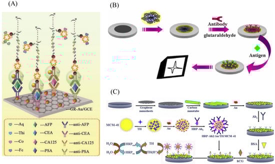 (A) Schematic illustration of the principle of sandwich-type simultaneous detection of four antigens. (B) Fabrication steps of the label-free electrochemical immunosensor. (C) Fabrication process of Au/TH/MCM-41 nanomaterials and the measurement protocol of the electrochemical immunosensor. Figures reproduced with permission from: (A) [], Elsevier©; (B) [], Elsevier©; and(C) [], Elsevier©.
