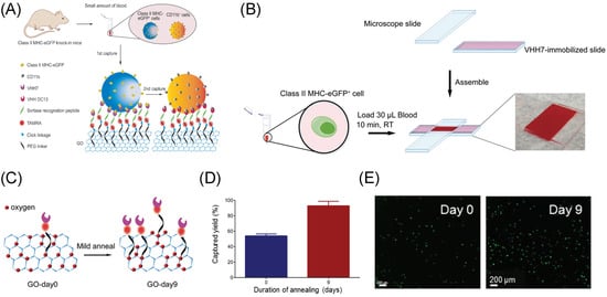 (A) Schematic of VHH7 and VHH DC13-based GO substrates for capture of Class II MHC-eGFP+ and CD11b+ cells from whole blood. (B) Schematic of the cell capture device made from glass slides, the assay conditions, and a digital photograph of the constructed and loaded capture chamber. (C) Schematic showing enhanced functionalization of GO nanosheets because of oxygen clustering on the graphene basal plane. GO-Day 0 represents as-synthesized GO sheets with no annealing treatment, while GO-Day 9 represents GO substrates annealed for 9 days at 80 °C to induce oxygen clustering. (D) Cell capture efficiency of annealed GO structure (Day 9) compared to that of as-synthesized structure (day 0). (E) Quantification of captured class II MHC-positive eGFP+ cells from murine whole blood samples comparing Day 0 and Day 9 samples. Figures reproduced with permission from: (A) [], Wiley©; and (B–E) [], ACS©.