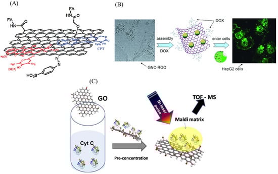 (A) Schematic representing the loading of DOX and CPT drugs onto FA-NGO on both sides of the graphene sheets. (B) Schematic of gold nanoclusters (GNCs) impregnated onto rGO nanosheets as nanocarrier for doxorubicin (DOX) for the inhibition of HepG2 hepatocarcinoma cells. (C) Schematic of GO platform for pre-concentration of Cyt C coupled with MALDI-TOF MS for the detection of Cytochrome C protein solution. Figures reproduced with permission from: (A) [], Wiley©; (B) [], Wiley online library©; and (C) [], ACS©.