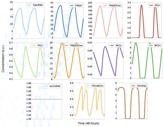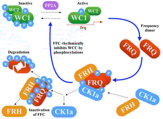 Figure 1 demonstrates the transcription-translation feedback loop, which consists of the inhibitory protein Frequency (FRQ), the activating transcription factor White Collar Complex (WCC), the FRQ stabilizer Frequency-interacting Helicase (FRH), and the Casein Kinase-1a (CK1a). Oscillations are based on delayed negative feedback. In Neurospora, clock gene frequency inhibits its own transcription after intermediate steps such as transcription, translation, dimerization, phosphorylations, and nuclear import. Moreover, stabilization of FRQ is governed by FRH and CK1a binding in forming the FFC complex. Later, FFC is involved in the inhibition of WCC-induced transcription [,,].