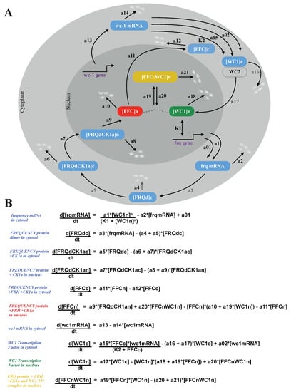 Understanding circadian clocks quantitatively helps to explore their functional significance in different organisms []. In mammals, a functional clock can help to prevent diseases such as cancer, obesity, and depression []. To reveal the basic mechanisms of the underlying gene-regulatory network (see Figure 1), Neurospora crassa has been established as a useful model organism [].