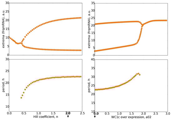 Bifurcation diagrams: The upper graphs show the maxima and minima of oscillations for varying parameters n (Hill coefficient) and a02 (WC1c overexpression). The lower graphs depict the corresponding periods. It turns out that oscillations persist for Hill coefficient n between 0.5 and 2.5, whereas overexpression of WC1 (a02) can terminate rhythms. Default parameter values are marked by bold numbers and arrows.