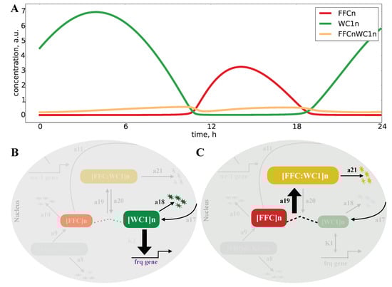 Inactivation switch in the Neurospora clock model: The FFCn levels (red line) are most of the time lower than the WC1n levels (green line), and only a small fraction of WC1n is bound to FFCn (yellow line) (see A). Below, we distinguish on and off phases. (B) points to an active WC1 (the thick line indicates strong binding to frq promoter) with a small degradation rate a18 (thin line). (C) illustrates the off state with FFC-assisted inactivation of WC1. Here, we have a strong binding of FFC to WC1 (a19 > a20) and fast degradation (a21 > a18).