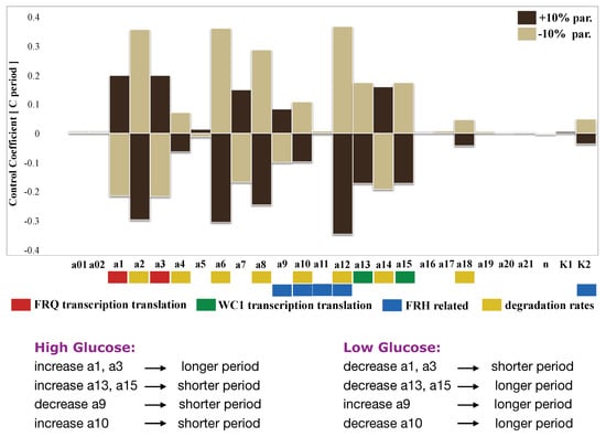 To quantify period changes for varying the parameters, we calculated the control coefficients by quantifying the sensitivity of the system. In Figure 6, we show a comprehensive control analysis of our model along the lines of [,,]. All parameters were changed by ±10 percent, and the corresponding period changes were extracted from the simulations. A positive period control coefficient of 0.5 implies that a 10 percent parameter increase induced a period lengthening by five percent, i.e., about 1 h. Our analysis confirmed the well-known feature that faster degradation of frequency leads to shorter periods [], as discussed above for the mutant (see the yellow bars associated with increasing parameters a2, a4, a6, a8, and a10).