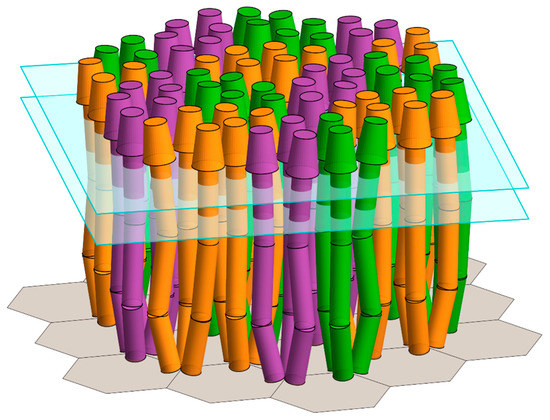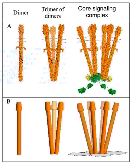 The Mathematica software suite was used as described previously for E. coli [8], and as outlined in more detail in the Supplementary Materials (Figures S5–S8) to model the geometry of core signaling complexes and their arrays. Our modeling tool is available as a Mathematica Computable Document Format (cdf) file, that can be downloaded from https://doi.org/10.32469/10355/68127 (accessed on: 23 May 2019). It requires an installation of the free Wolfram Player (https://www.wolfram.com/player/ accessed on: 23 May 2019) or the full Mathematica suite. For E. coli modeling we used the published values for the key geometric parameters. For our wider analysis, we varied the dimensions and angles of the receptor dimers, trimers of those dimers and core complexes, but maintained the symmetrical, hexagonal organization of the arrays [11,33] and the placement of trimers of receptor homodimers at each hexagonal vertex [4,5,19,33]. Geometric models were generated as Graphics3D [34] objects using Mathematica 11.1, with each dimer and constituent section rendered as an independent, non-interacting object.