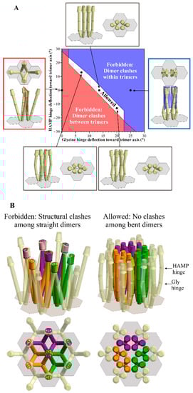 One of these hinges, the HAMP hinge, is at the short, two-strand gap between the membrane-proximal, four-helix-bundle HAMP (Histidine kinases, Adenylate cyclases, Methyl accepting proteins and Phosphatases) domain and the membrane-distal, extended four-helix coiled coil of the chemoreceptor cytoplasmic domain. The other, the glycine (Gly) hinge, is in the midst of the extended coiled coil at a cluster of glycines in a region suggested to be a flexible bundle [9,10]. Figure 2A summarizes our previous observations about the geometry of E. coli core complexes and arrays, illustrating that straight receptors would collide, but that collisions could be avoided by receptor bending at one or both of the flexible receptor hinges, albeit over a narrow window of shallow angles of bending [8]. Figure 2B illustrates the extensive structural clashes among straight chemoreceptor dimers in a small array of E. coli core complexes, and an example of an avoidance of structural clashes by bending at the two flexible hinges.