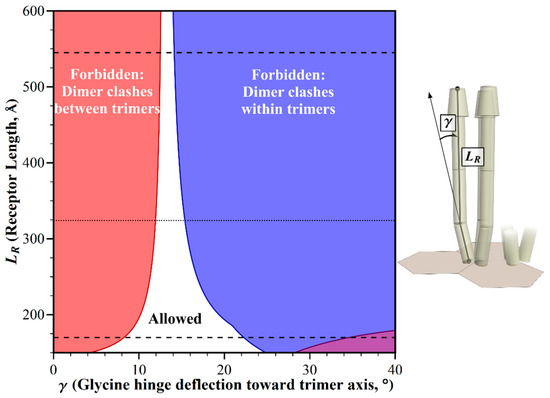 Geometric restrictions in core signaling complexes and their arrays as a function of chemoreceptor length, LR and glycine hinge deflection, γ. The plot shows the structural consequences of the combinations of receptor length and glycine hinge deflection. For allowed combinations (white area), receptors fit into the available space. For any forbidden combinations, they do not, because of structural clashes between dimers in neighboring trimers (red areas), or in the same trimer (blue areas). Estimated lengths of the longest and shortest receptors that could be assembled by combining the longest or shortest known receptor segments (see Materials and Methods), are marked by dashed lines. A dotted line marks the length of the E. coli receptors.