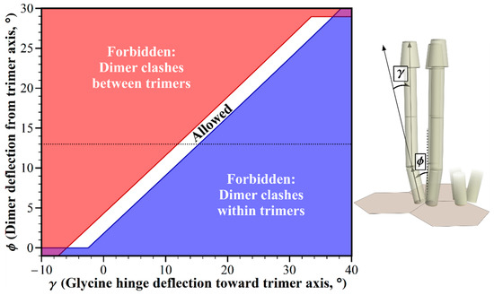 Geometric restrictions in core signaling complexes and their arrays as a function of dimer deflection, ϕ and glycine hinge deflection, γ. The plot shows the structural consequences of the combinations of dimer deflection from the trimer central axis, and the glycine hinge deflection toward the trimer axis. For the allowed combinations (white area), receptors fit into the available space. For any forbidden combinations, they do not, because of structural clashes between the dimers in neighboring trimers (red areas), or in the same trimer (blue areas). The 13° dimer deflection for an E. coli receptor trimer [18] is marked with a dotted line.