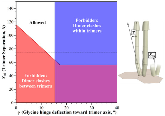 Geometric restrictions in core signaling complexes and their arrays as a function of trimer separation, Stri and glycine hinge deflection, γ. The plot shows the structural consequences of the combinations of trimer separation and glycine hinge deflection. For any allowed combinations (white area), the receptors fit into the available space. For those forbidden combinations, they do not, because of structural clashes between dimers in neighboring trimers (red areas), or in the same trimer (blue areas). The 75 Å trimer separation in E. coli chemoreceptor arrays [5] is marked with a dotted line.