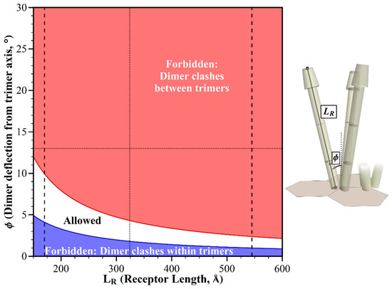 A 75 Å separation between trimers of dimers is widely conserved across bacterial diversity [11]. However, if there are situations, or as-yet-uncharacterized species, in which trimer separation had different values (see the previous section), the combinations of trimer separation and the receptor length (Figure S1), or of trimer separation and dimer deflection (Figure S2) would generate allowed orientations only for values that are significantly different from any known or projected values.