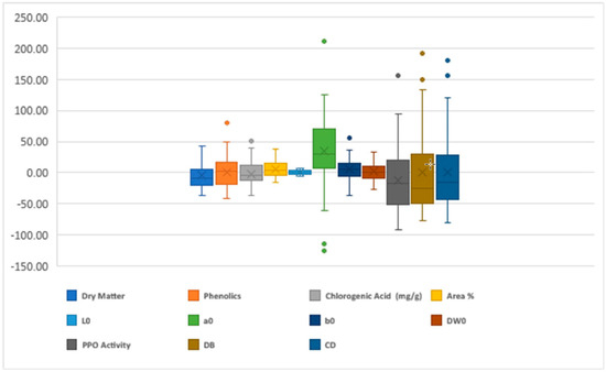 Twenty-one out of a total of fifty-five correlations were significant at p < 0.05. Three of these correlations presented high absolute values (~0.90); two of these were positive correlations (between DB and CD, and between b*0 and DW0), while the other one was negative (between L*0 and DW0) (Table 5). Dry matter was positively correlated with DB and CD (Table 5). Total phenolics and GCA were not correlated with any other trait. However, when considering the area percentage of chlorogenic acid chromatogram, it was found to be positively correlated to L*0 and negatively correlated to b*0, DW0, PPO activity, and CD (Table 5). A moderately positive correlation of PPO activity was noticed with DB and CD (Table 5).