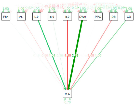 Simple correlations between traits do not provide very reliable information regarding the components that resulted in this kind of relationship. The path coefficient analysis technique provides information regarding the independent variables and the way they affect a dependent trait (directly or indirectly). The standardized effect of both latent and observed variables is provided in Figure 2. The largest positive effect was exhibited by DW0 (2.89) followed by L*0 (1.54), and the remaining chromameter parameter b*0 (−1.98) showed a negative effect (Figure 2). Whereas, total phenolics content showed no effect on the chlorogenic acid content (Figure 2).