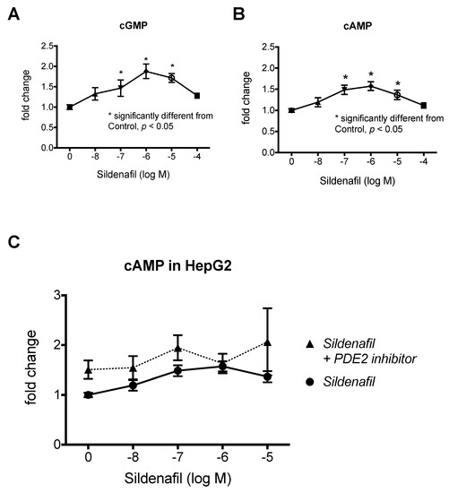 Effects of sildenafil on cGMP and cAMP concentrations in HepG2 cells. (A) Intracellular cGMP and (B) intracellular cAMP concentrations in HepG2 cells treated with sildenafil (10 nM to 100 µM) for 30 min. Data were calculated and statistically analyzed as fold change of control and are expressed as means ± SEM (n = 3 to 6, p ≤ 0.05) (absolute values for control means are 1.642 pmol cGMP/mg protein and 3.45 pmol cAMP/mg protein). (C) Comparison of cAMP response in HepG2 cells treated with sildenafil (10 nM to 10 µM) +/− PDE2 inhibitor (BAY 60-7550, 10 uM) for 30 min.