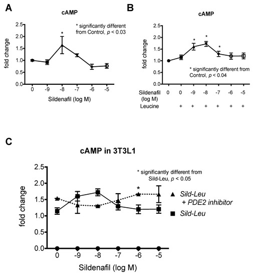 We previously found sildenafil to synergize with leucine and leucine-metformin combinations in preclinical studies of NASH and obesity and that a leucine-metformin-sildenafil combination exerted a therapeutic benefit in nonalcoholic fatty liver disease (NAFLD) and obesity [9,31,32,33]. However, we observed a sildenafil “U-shaped” dose response relationship for most NASH-related variables and body weight, with diminished efficacy at higher sildenafil concentrations (unpublished data). Herein, we have successfully modeled the U-shaped sildenafil dose-response in vitro and utilized this model to assess potential mechanisms of this dose-response relationship. Our data demonstrate an expected cGMP response to sildenafil, which is accompanied by a biphasic cAMP response. We hypothesize that, at low concentrations, sildenafil can inhibit PDE3 and, thereby, induce up to a two-fold increase in cAMP, whereas, at higher concentrations, this effect is reversed due to indirect activation of PDE2. These effects on cAMP are subsequently reflected in changes in AMPK phosphorylation and activation.