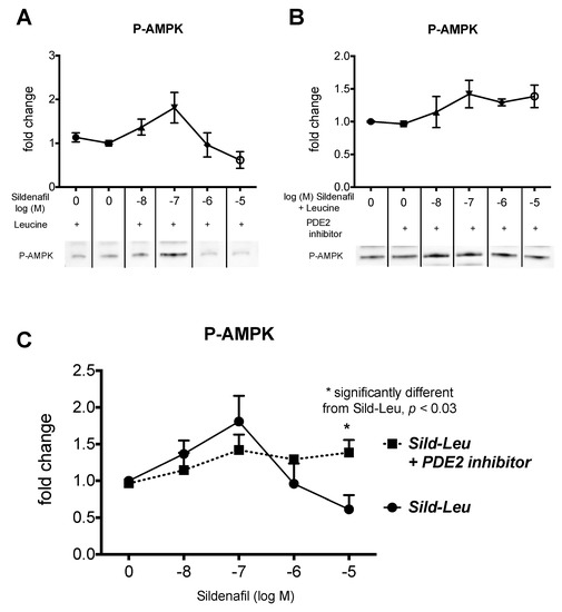Protein expression of Phospho (Thr172)-AMPK in HepG2 cells. Protein expression of Phospho (Thr172)-AMPK in HepG2 cells treated with a fixed dose of leucine (0.5 mM) in combination with (A) sildenafil (10 nM to 10 µM) or (B) sildenafil (10 nM to 10 µM) plus the PDE2 Inhibitor (BAY 60-7550, 10 uM) for 24 h. Graphs were calculated from pooled densitometry measurements of two different blots (n = 3 to 4) and representative blots are shown. (C) Comparison of P-AMPK response to Sildenafil-Leucine for the addition of the PDE2 inhibitor. * indicates a significant difference between the curves (p < 0.03).