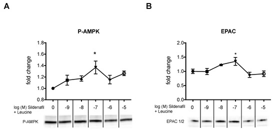 Leucine synergizes with sildenafil and other eNOS activators to exert amplifying downstream effects of AMPK and Sirt1 activation on glucose and fat metabolism [9,11]. When we tested this hypothesis with a fixed dose of leucine and increasing concentrations of sildenafil, we found a significant upregulation of P-AMPK up to 100 nM sildenafil followed by decreases at higher doses (Figure 1). Although the best known action of sildenafil is inhibition of PDE5, sildenafil also activates eNOS, which results in increased NO/cGMP signaling with subsequent activation of the cGMP-dependent protein kinases (PKGs) [37,38]. Moreover, leucine synergizes with sildenafil to amplify downstream effects on AMPK, and pathway to reverse NAFLD in preclinical mouse models [9].
