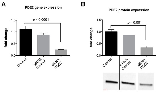 Cells were grown in a 96-well plate. Cell Lysis, reverse transcription, and RT-PCR were performed using the TaqMan® Gene Expression Cells-to Ct™ Kit (Life Technologies (Thermo Fisher Scientific, Waltham, MA, USA), Cat # 4399002), according to the manufacturer’s instructions. Gene expression was assessed by RT-PCR using the StepOnePlus™ PCR system (Thermo Fisher Scientific, Waltham, MA, USA) and TaqMan Gene expression assays for PDE2 (Life Technologies, Cat #HS00159935_m1)).