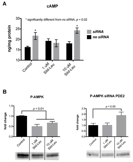 We then performed siRNA experiments to silence PDE2 in HepG2 hepatocytes. We confirmed the silencing via both PCR and protein expression. PDE2 expression was reduced by ~70% after treating the cells with PDE2 siRNA (Figure 5). After silencing, we treated the cells with sildenafil (1 uM and 10 µM) in combination with leucine. Similar to the results with the PDE2 inhibitor, cAMP concentrations were increased at 10 uM Sild-Leu in PDE2 knockdown cells compared to the wild-type cells (Figure 6A), and the reduction in P-AMPK expression with the higher Sild-Leu dose (10 µM) was prevented in the knockdown cells (Figure 6B).