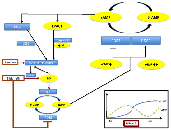 Sildenafil’s predominant action is the inhibition of phosphodiesterase 5 (PDE5) and a resultant increase in intracellular cGMP, which results in therapeutic utility for both erectile dysfunction and pulmonary hypertension [17,18,19]. However, low concentrations of sildenafil also activate endothelial nitric oxide synthase (eNOS), which results in nitric oxide induced increase in cGMP as well as in stimulation of the AMPK/Sirt1/PGC1α pathway and synergy with leucine [18,20,21]. Furthermore, the cGMP-cAMP feedback system may either amplify or inhibit the effects of Sild-Leu on the target AMPK/Sirt1/PGC1α pathway, since changes in cAMP are also reflected in corresponding changes in AMPK activity via the PKA-EPAC1 pathway [22].