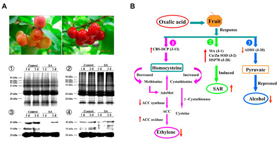 ROS is involved in the responses to salicylic acid (SA) and oxalic acid by modulating protein carbonylation, ethylene biosynthesis, and alcohol dehydrogenase (ADH) by-pass [29,41]. After inoculation with Penicillum expansum, less carbonylated proteins were accumulated in SA-treated sweet cherry fruit than in control fruit (A), whereas ROS acted synergistically with ethylene biosynthesis/signaling and ADH by-pass in the responses to oxalic acid (B). CBS-DCP: CBS domain-containing protein (J-13); MA: major allergen (J-1); Cu/Zn SOD: Cu/Zn superoxide dismutase (J-2); HSP70: heat shock protein 70 (J-28); ADH1: alcohol dehydrogenase 1 (J-20); PDH E2: dihydrolipoamide acetyltransferase (E2) of pyruvate dehydrogenase complex (J-14); AdoMet: S-adenosylmethionine; ACC: 1-aminocyclopropane-1-carboxylic; SAR: systemic acquired resistance.
