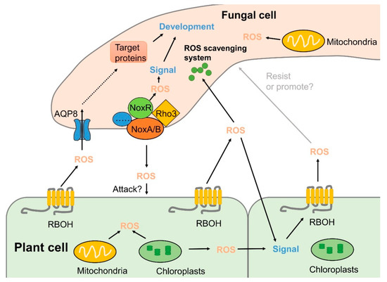 Postharvest diseases induced by fungal pathogens are the principal causes for fruit decay, which leads to tremendous economic losses annually [1]. In the case of pathogen infection, fleshy fruits rely on their own innate immune capacity to resist pathogen attack [2]. Excessive reactive oxygen species (ROS) production in response to unfavorable conditions, also known as oxidative burst, has been recognized as one of the earliest induced defense responses in plants [3]. This production of ROS is biphasic: the first phase usually occurs within minutes after pathogen attack but is transient and weak, whereas the second phase is much more intense and sustained, lasting for several hours [4]. However, overproduction of ROS causes impairments in DNA, lipids, and protein, eventually leading to cell death and progressive aging of an organism [5,6,7]. Generally, senescent fruits always display higher susceptibility to pathogen attack, and, in turn, senescence and decay are accelerated in infected fruit [8]. For pathogens, ROS also play an important role in their infection processes, and the lack of ROS-producing systems can affect fungal toxicity and their interaction with plants [9,10,11]. During this interaction, pathogens may encounter ROS generated by the host and, as a result, they may be directly killed. On the other hand, cell death caused by ROS may lead to cellular necrosis in the hosts, from which quiescent pathogens (hemibiotrophic or necrotrophic) acquire nutrients, switching into the devastating necrotrophic life mode [1,12]. In order to cope with oxidative stress, both plants and pathogens have evolved efficient scavenging systems to modulate ROS homeostasis, which eventually determine the incidence, development, and consequences of diseases in plants [3,13]. Considerable progress has been made in understanding the mechanisms regulating plant–pathogen interactions. Here, we mainly focus on the current advances in the study of fruit–pathogen interactions mediated by ROS, which may broaden our understanding of the role of ROS in fruit defense and fungal pathogenicity.
