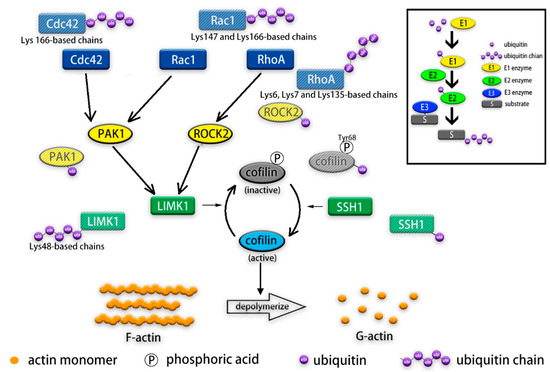 Post-translational modification (PTM) like ubiquitination is crucial for activities of actin cytoskeleton-related regulators (Figure 1). Ubiquitin is a highly conserved protein in eukaryotes consisting of 76 amino acid residues. Ubiquitin attaches through its C-terminal glycine to a lysine residue in the target protein as a tag post-translationally and forms an isopeptide bond [80,81,82]. The process of ubiquitin-proteasome system (UPS) degradation begins with activation of ubiquitin by E1 enzymes (or ubiquitin-activating enzymes). The second step involves the transfer of the activated ubiquitin to an E2 enzyme (or ubiquitin-conjugating enzyme). Activated ubiquitin can be transferred to the target protein by three kinds of E3s (also known as ubiquitin ligase): HECT (homologous to E6-AP C-terminus) domain-containing E3s, RBR (RING-between-RING) family E3s and RING (really interesting new gene) finger domain-containing E3s. The former two receive the activated ubiquitin from E2 and subsequently transfers it to the target protein; the latter one catalyzes the transfer of activated ubiquitin from E2 enzyme to the target protein directly [81,83,84,85]. E3 ligase then transfers activated ubiquitin to its substrate, sometimes repeatedly to form polyubiquitin chains. In polyubiquitin chains, monomers may conjugate via several lysine residues or N-terminal methionine residue, producing different ubiquitin signals [86]. Polyubiquitin chains linked via residues such as Lys48 and Lys63 may lead to the proteasome-dependent degradation of the substrate [87].