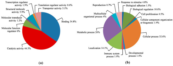 Pie chart of the broad biological functions associated with proteins identified by label-free mass-spectrometry liquid chromatography (LC–MS/MS) in the pooled sperm samples. Molecular functions (a) and biological processes (b) of the 1962 identified proteins were analyzed by the PANTHER database.