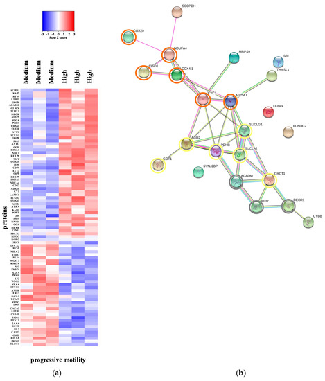 (a) Heat map of the expression of proteins which showed p < 0.05 in an unpaired, two tails t-test medium group (asthenozoospermic samples with ~24% of progressive motility) vs. high group (normozoosperic samples with ~44% of progressive motility). (b) Interactions among the three proteins involved in the polyunsaturated fatty acids catabolism (grey circles), Krebs tricarboxylic acid cycle (TCA) process (yellow circles) and oxidative phosphorylation (OXPHOS) process (orange circles) down-regulated in the human samples with medium progressive motility in comparison to normozoospermic samples. Interactions maps were prepared using the STRING database program. Thicker lines represent stronger associations, and thinner lines represent medium associations.