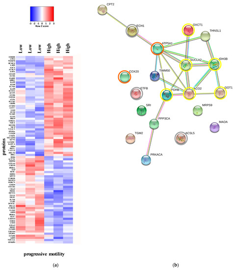 (a) Heat map of the expression of proteins which showed p < 0.05 in an unpaired, two tails t-test low group (asthenozoospermic samples with ~12% of progressive motility) vs. high group (normozoosperic samples with ~44% of progressive motility). (b) Interactions among the four proteins involved in the fatty acids catabolism process (grey circles), TCA process (yellow circles) and OXPHOS process (orange circles) down-regulated in the human samples with low progressive motility in comparison to normozoosperic samples. Interactions maps were prepared using the STRING database. Thicker lines represent stronger associations, and thinner lines represent medium associations.