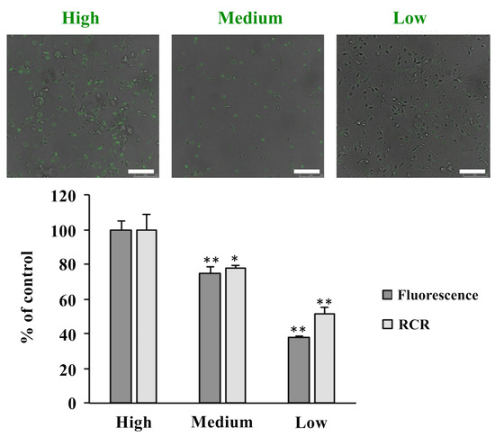 ** p < 0.01; p (low vs. high) = 0.001393941(fluorescence intensity) and 0.009342592 (RCR value); p (medium vs. high) = 0.002197388; * p < 0.05; p (medium vs. high) = 0.04372016.
