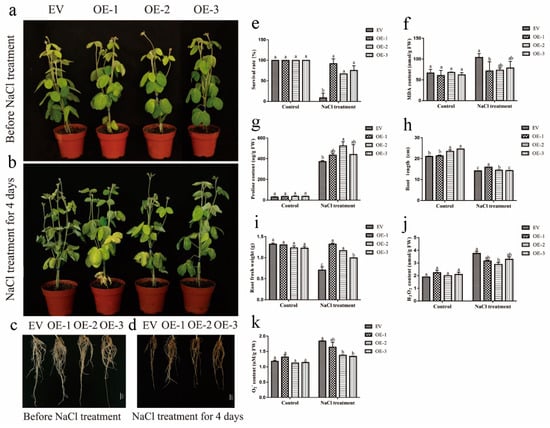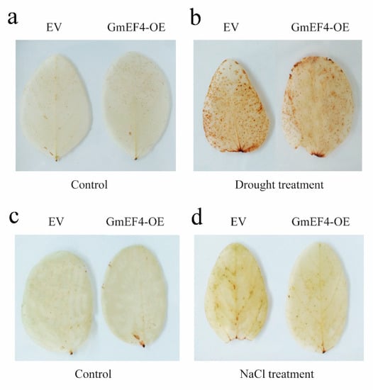 2.10. Overexpression of GmEF4 Reduced the Content of H2O2 under Drought and Salt Stresses