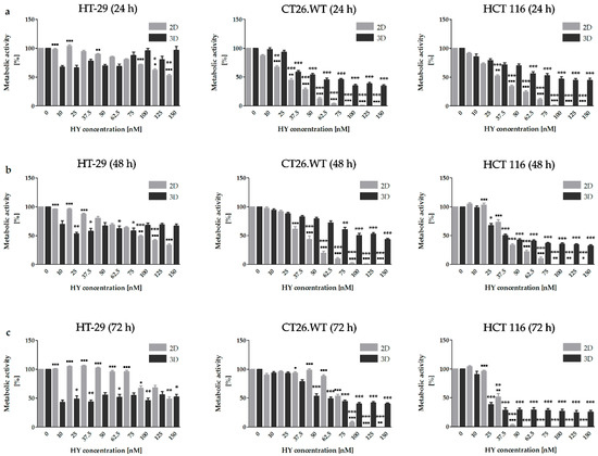 Metabolic activity was assessed as an overall signal resulting from the number of metabolizing cells (HT-29, HCT 116 and CT26.WT) and the intensity of their metabolism after exposure to HY-PDT for 24, 48, and 72 h (Figure 1) and in the HP treatment for 48 and 72 h (Figure 2). HY was applied in the concentration range of 0–150 nM and HP in the range of 0.5–50 µM. It is known that HY in the dark possesses zero or minimal toxicity [27,28,29,30,31]. Some biological effects on more sensitive cancer cell lines were described after the application of approximately eight times higher concentrations of non-photoactivated HY than our highest concentration was (150 nM). In relation to less sensitive cancer cells, after the application of approximately seventy times higher concentrations, some biological effect was detected [32,33,34,35]. More specifically, in connection with the growth factors analyses in the cancer cells treated with non-photoactivated HY, the effect was noticed only with the utilization of two hundred times higher concentration (30 µM), in comparison to our highest concentration [36]. When speaking of HY-PDT, these are the main reasons why the other authors also considered the non-treated cells or tumors to be a control [12,21,22,37,38]. Based on these facts, in our experiments utilizing HY-PDT non-photoactivated HY as dark control was did not use and we also considered the concentration of 0 nM HY as a control. In the 2D cell model, time- and dose-dependent inhibitory effects on the metabolic activity was observed in all cell lines after HY-PDT and HP treatment. Lower doses of HY demonstrated no or even a stimulatory effect on metabolic activity in the 2D cell models. HT-29 cells in both experimental models showed the highest resistance to HY-PDT treatment in all chosen time intervals. In 2D cell models, this can be associated with our observations from flow cytometry analyses, where there was the lowest accumulation of HY observed in the HT-29 cell line. In general, a significantly higher accumulation of HY was observed in the 2D cell models compared to the 3D cell models in all experimental cell lines. The significantly lower accumulation in the 2D cell models was observed in HT-29 in comparison to two other experimental cell lines in all HY treated groups. On the contrary, in the 3D cell models no significance was observed between the compared cell lines (Figure 3).