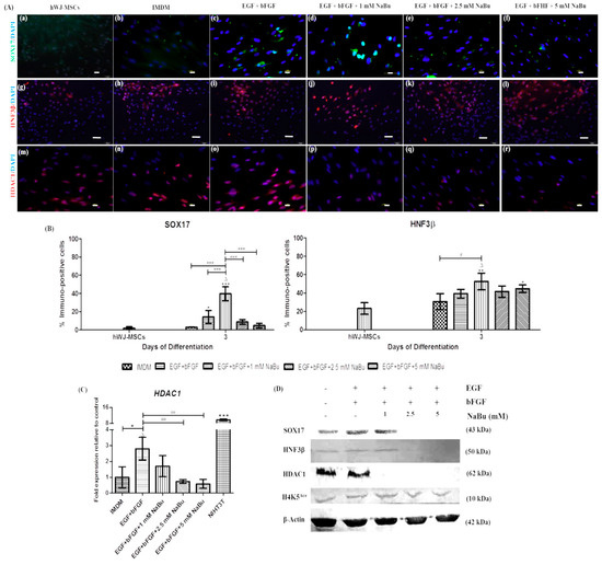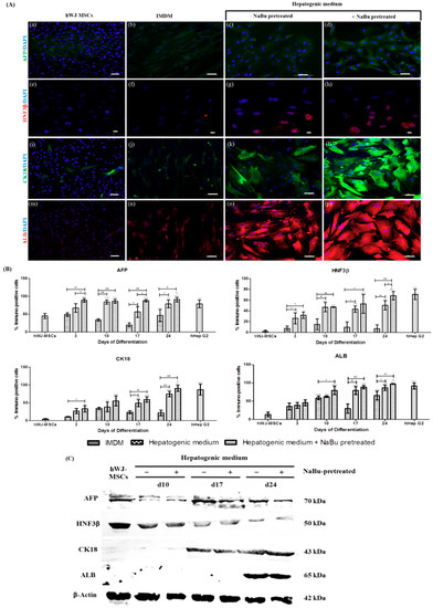- Allahbakhshi, E.; Hashemitabar, M.; Shariati, M.; Tabandeh, M.R.; Solgi, G. Differentiation of the definitive endoderm from Wharton’s Jelly Mesenchymal Stem Cells (WJMSC). J. Biol. Res. 2013, 20, 217–227. [Google Scholar]