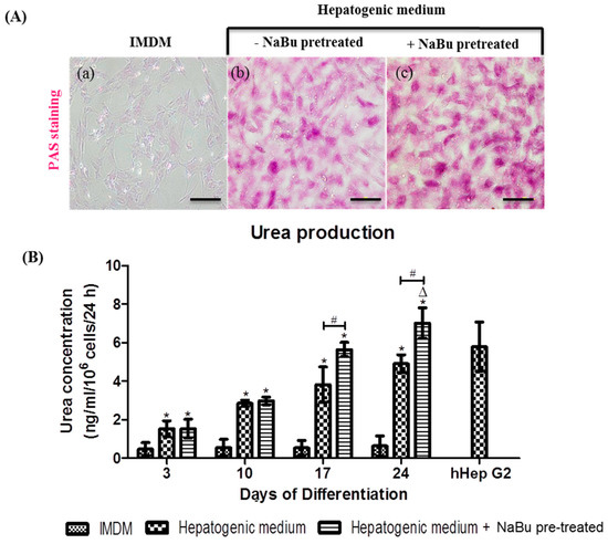 - An, S.Y.; Han, J.; Lim, H.J.; Park, S.Y.; Kim, J.H.; Do, B.R.; Kim, J.H. Valproic acid promotes differentiation of hepatocyte-like cells from whole human umbilical cord-derived mesenchymal stem cells. Tissue Cell 2014, 46, 127–135. [Google Scholar] [CrossRef] [PubMed]